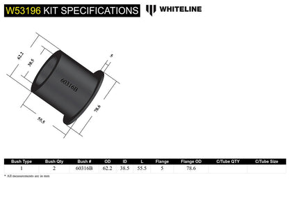 Worn front control arm bushings have a huge influence on vehicle stability, steering precision and braking efficiency. Replace worn bushings to as new condition utilising Whiteline's advanced synthetic elastomer bushings with core characteristics ensuring superior elasticity, memory and outright durability for all forms of driving applications.
